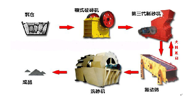 機制砂石設備基本流程:先石料由粗碎機進行初步破碎,然后,產成的粗料由膠帶輸送機輸送至細碎機進行進一步破碎,細碎后的石料進振動篩篩分出兩種石子,滿足制砂機進料粒度的石子進制砂機制砂,另一部分返料進細破。進制砂機的石子一部分制成砂,經(jīng)洗砂機(可選)清洗后制成成品砂,另一部分進制砂機再次破碎。