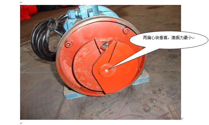 四:貴方可根據(jù)現(xiàn)場(chǎng)需要調(diào)整刻度達(dá)到貴方所需的激振力。調(diào)整時(shí)電機(jī)兩端的偏心塊要同時(shí)調(diào)整。當(dāng)一端調(diào)整的夾角為0.8時(shí),另一端也需要調(diào)到0.8。當(dāng)完全調(diào)整好后,擰緊活動(dòng)偏心塊的固定螺栓。裝上電機(jī)兩端的罩殼后通電運(yùn)行。