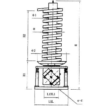 - ZC垂直振動輸送機的驅動裝置振動電機安裝在輸送塔下部,兩臺振動電機對稱交叉安裝,輸送塔由管體和焊接在管體周圍的螺旋輸送槽組成,輸送塔座于減振裝置上,減振裝置由底座和隔振彈簧組成。